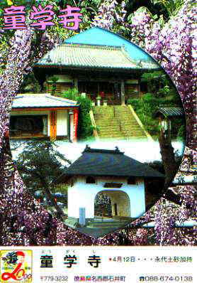 | 童学寺崎縁起 高祖弘法大師学問所童学寺は、日本の大偉人弘法大師さま、ご幼名を神童と称せられし頃に、 当山に久しく留滞なされて、学問御修行遊ばされました由緒深き所由を以って寺号とす お大師さまは当山において、「いろは歌」四十七文字を創作せられて、児童等にひろく教えられた。 これは日本の民衆教育の最初であり、この「いろは歌」により日本文化の発展の基礎を創られた ことは、お大師さま御一代の御事業中特筆すべ千古に輝く御功績である境内裏庭遭遇園入口 には、大師が硯の水を求めたというお筆の加持水という泉があり、以来蒜も水の絶える事を知ら ない。この水を飲めば緒病はことことく治癒し、現にたくわえ書道の修練に用いたなら誰でも筆達 者になれる等々、この霊泉は大師を静かにたゆまなく今に語り伝えるのである。後、弘法大師は この地に噂て厄除薬師如来面宝「阿弥陀如来、観世音菩薩、持国天、毘沙門天、歓喜天(いずれ も準国宝)を彫刻し、一小笠を建立し薬師如来を本尊としてこれを安置し、日を重ねて祈り夜を重ね て誓われたのである。この薬師如来こそ当寺に現存する卸本尊である. |